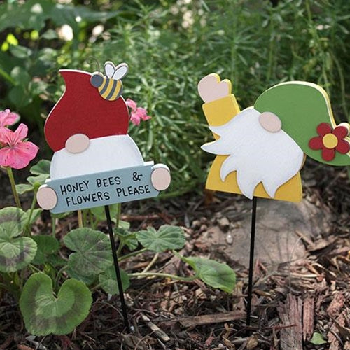 Gnome Honey Bees Flowers Please Plant Poke sells as an assortment of two designs with garden themed-wooden gnomes on a metal stake. One gnome hold...