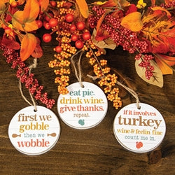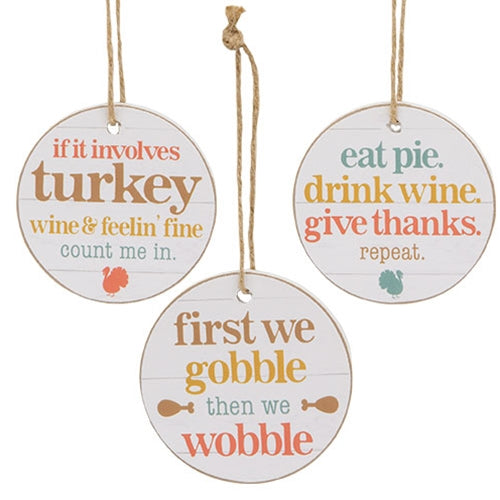 The Gobble Til You Wobble Turkey Leg Ornaments are an assortment of three decorative wooden cutout ornaments in the shape of turkey legs, with a na...