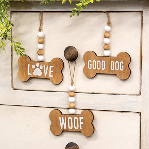 Good Dog Beaded Bone Ornament is an assortment of three brown wooden cutout ornaments shaped as dog bones. The bones feature stamped white text, ea...