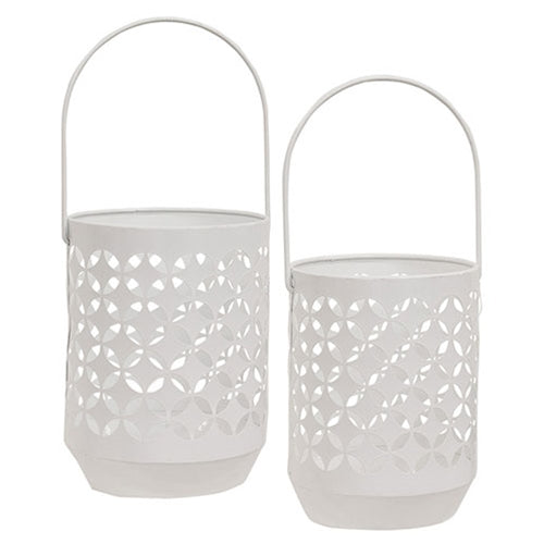The Geometric Trellis Lanterns are a set of two decorative bucket containers made of white metal. The containers have rounded metal handles and a c...