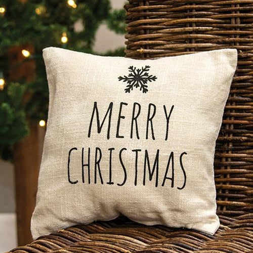 The Merry Christmas Snowflake Pillow is a decorative throw pillow made with a natural ivory linen-style fabric. The pillow reads "Merry Christmas"...