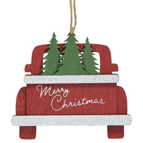The Merry Christmas Truck Ornament is a decorative wooden cutout ornament with a white background and a red border. The sign reads "Merry Christmas...