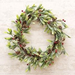 Merry Mistletoe Ring is a winter floral that features a mix of red foam and icy frosted berries, frosted mini pinecones, and glittered plastic leav...