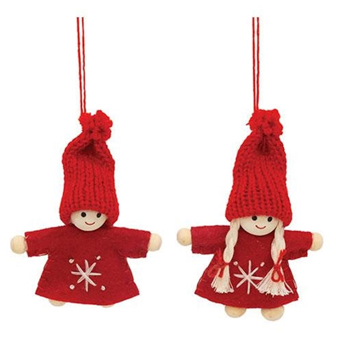 The Mini Snowflake Stitched Doll Ornaments are an assortment of two wooden doll figurines wearing red felt dresses with a stitched white snowflake ...