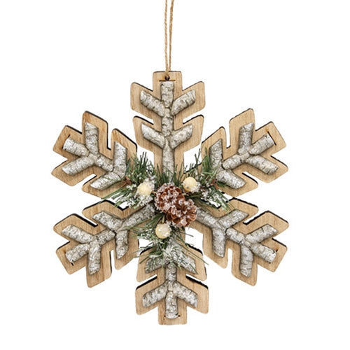 The Birch Pine Snowflake Ornament is a decorative wooden ornament with a cutout snowflake silhouette. The snowflake has textured birch wood detaili...