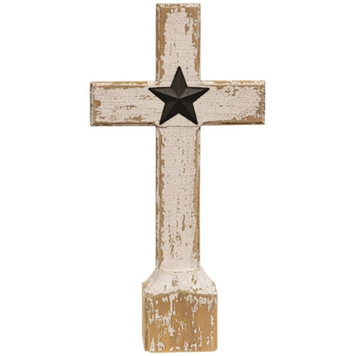 The Cross with Barn Star is a decorative pedestal cross figurine made of light-grain wood with a weathered coat of ivory paint. The cross features ...