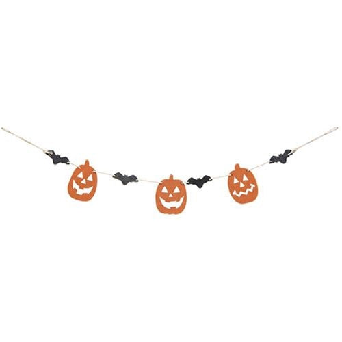 The Jack O Lantern Bat Garland is a decorative length of ivory string, adorned with wooden cutout charms of orange jack-o-lanterns and black bats. ...