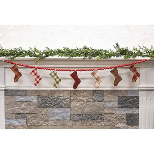 The Plaid Stockings Beads Garland is a Christmastime string garland with round wooden beads in a bright red color. The garland features wooden sto...