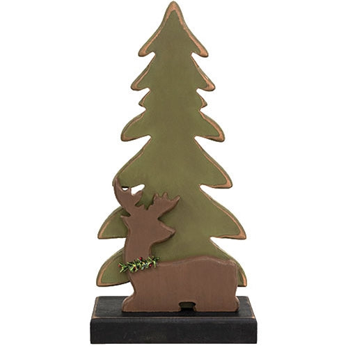 Wooden Pine Tree & Reindeer is a chunky wood decor piece made with festive rustic style. The piece depicts a reindeer wearing garland on its ne...