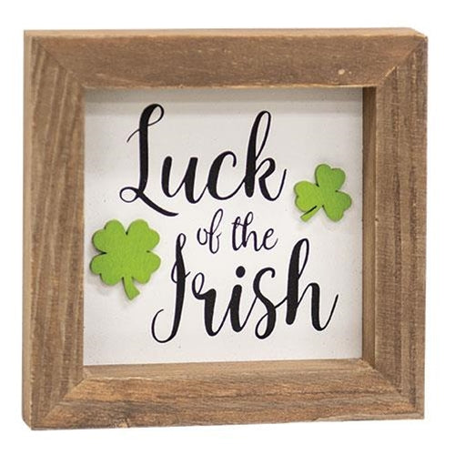 Luck of the Irish Shadowbox Frame is a wooden sign with an unpainted frame and white background. It comes ready for wall display with a pre-install...