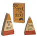 Trick or Treat Candy Corn Blocks sell as a set of three wood block sitters with a Halloween theme. Set includes two candy corn blocks that say, "Trick or Treat," and, "Candy Corn." The third block features a spider and web design with the phrase, "Trick or Treat." Spider block is 2" wide by .75" deep and 3" high. Larger candy corn is 2 wide by .75" deep and 3.5" high. Smaller candy corn is 1.25" wide by .75" deep and 2" high.