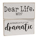 The Dear Life Blocks are an assortment of two decorative wooden block signs with a white painted finish and natural worn edges. The blocks have printed black lettering and read “Dear Life, WTH?” or “Apparently I’m dramatic”. These blocks are humorous and great for display in the everyday home, freestanding or hanging on a wall using the keyhole hangers on the back. Each block measures 3” high by 6” wide by .75” deep. Please note: This item features a variety of designs which are each sold individually (not as a set).
