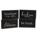 Kindness Sentiment Distressed Wooden Blocks bring a thoughtful touch to everyday decor. The blocks each feature a rich black finish with distressed edges for a unique rustic look. White text in a mix of script and print adorns each block. One reads “kindness changes everything,” one reads “kindness matters,” one reads “choose kindness,” and one reads “be kind.” The blocks are freestanding for stable display on a flat surface. Each measures 3” high by 6” wide by .75” deep. Please note: This Item features a variety of designs which are each sold individually (not as a set). Please add a note in your cart to indicate your preference. If no style is specified, one will be selected at random by our team.