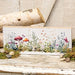 The Mushroom & Wildflower Patch Rectangle Block is a wood block printed with colorful nature-inspired design. The block features a white woodgrain background and has unfinished edges for a rustic look. A diverse arrangement of ferns, grasses, wildflowers, and other botanicals is printed on the block in rich green, blue, orange, and purple hues alongside a range of mushrooms. The block is freestanding for stable display on a flat surface. Measures 4” high by 9.5” wide by .75” deep.