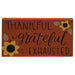 Thankful Grateful Exhausted Block is decorative wooden block with painted seasonal design. The burnt orange block features pale sunflower accents and black text that reads, "thankful, grateful, exhausted" in a mix of script and print. Measures 4" high by 7.25" wide by .75" deep.