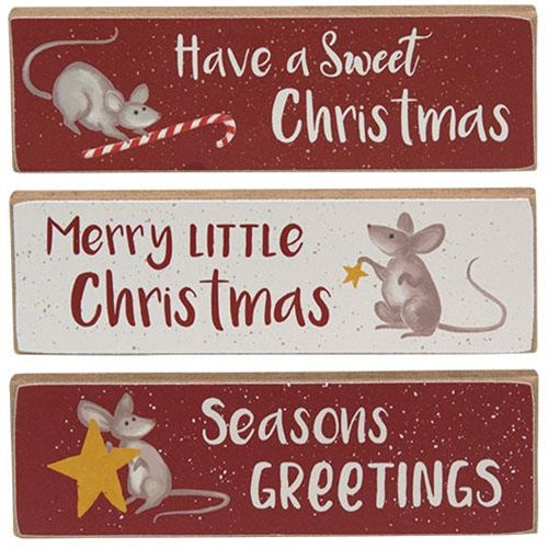 The Merry Little Christmas Mouse Blocks are an assortment of three decorative mini wooden blocks with a distressed painted finish. One block is red...