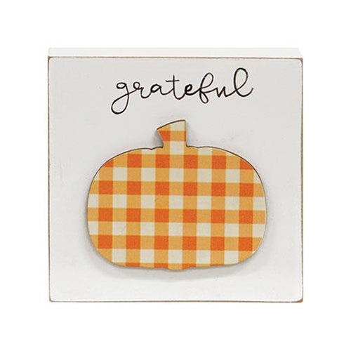 The Grateful Pumpkin Block is a petite wooden tabletop block painted white with worn edges. The sign reads “grateful” in black scripted lettering a...