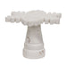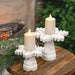 The Snowflake Candle Pedestal (shown at right) is a festive candle holder perfect for winter farmhouse displays. Made from wood, the piece sits on a tapered pedestal with a flat base for stable freestanding display. A carved snowflake serves as the pedestal’s platform, offering a festive accent. The pedestal is painted white and has a rustic distressed finish. Measures 6” high by 8” in diameter.