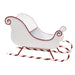 The Candy Cane Metal Sleigh is a festive farmhouse decor piece made with metal painted in seasonal shades. The sleigh features an allover white finish with whimsical styling and red painted accents. The sleigh runners look like candy canes with their classic spiral-stripe design. The sleigh is freestanding for stable display on a flat surface. Measures 12" high by 21" wide by 8" deep.