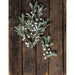 Frosted Mistletoe Pick is a festive winter floral that features green plastic leaves and white foam buds, covered in a healthy coating of silver glitter and assembled on a brown-wrapped floral stem. Measures 10" high.