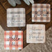 Fall Gingham Resin Coasters sells as a set of four resin coasters. Coasters have a cork bottom for stability and scratch prevention and each design includes a fall plaid pattern to complement seasonal decor. It reads, "hello fall" over orange plaid; "happy harvest" over brown plaid; "autumn leaves and pumpkins please" over tan plaid; or, "my favorite color is autumn" over gray plaid. Measures 4" high by 4" wide by .3" deep.
