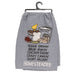 The Homesteader Dish Towel is a practical yet playful addition to any kitchen. Made from cotton, the towel has a dusty blue color and lightweight feel. Printed cartoon design depicts a pile of home-grown food that’s been climbed by a small yellow chick. Black text reads “veggie growin’, bread makin’, chicken raisin’, crazy cannin’, goat milkin’,” while white text reads “homesteader.” A hanging loop allows for easy drying and display. The back of the towel features white text that reads “primitives by Kathy, LOL, made you smile” in a handwritten style. Measures 28” high by 28” wide.