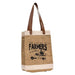 The Farmers Market Tote Bag features a lightweight burlap body, fabric trim, and two faux leather straps. It reads, "you had me at farmers market," in bold black letters. The famers market theme is complemented by the image of a vintage pickup truck carrying a cow, pig, and chicken. Measures 17" high by 13" wide by 8" deep.