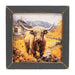 The Hey There Hershey Framed Print is a unique art piece made with farmhouse style. A brown highland cow is depicted with realistic painted style, shown standing in a golden field. The background features a mountain range and small cottage adorned with a rock path, fall trees, and tall grass. A wooden frame with a black stain and distressed finish holds the piece, and a keyhole hanger on the back allows for easy display. The print measures 12” high by 12” wide, and the frame measures 13.5” high by 13.5” wide by 1” deep.