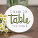 Farm to Table to Soul Round Easel Sign is a round wooden sign with a distressed white finish and easel-style stand. It reads, "farm to table to soul" in a mix of black text and raised green lettering and it is perfect for display on shelves, counters, and tabletops. Measures 5.25" in diameter and .25" deep.
