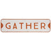 Gather White Metal Sign is an embossed metal sign with a distressed orange and white finish. Sign reads "Gather" in orange lettering and it has an orange border for detail. It has two pre-drilled holes for wall display and it measures 6" high by 23" wide by .25" deep.