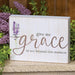 Give Me Grace Box Sign is a wooden box sign with white painted edges and a white shiplap background. The sign reads "give me grace to see beyond this moment" in black and taupe lettering and is decorated with a bundle of purple lavender flowers. The sign can be displayed freestanding or can be hung on a wall with a nail. Measures 6" high by 8" wide by 1.5" deep.