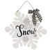 The Glittered Let it Snow Snowflake Sign is a wooden hanging sign with sparkling seasonal design. The sign features a layered white wood design complete with glittered edges. The sign includes an attached black wire hanger for versatile display on a wall or door. The design features a trio of snowflakes and a black and white gingham bow and reads, "let it snow." Measures 13.75" in diameter and .5" deep.