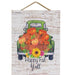 Happy Fall Y'all Hanging Sign depicts the back of a green pick-up truck. Truck has a bed filled with pumpkins and fall flowers for a pop of color and sign reads, "Happy Fall Y'all" in black text. Background has a woodgrain pattern for a rustic feel and sign measures 7.5" high by 5.5" wide by 1" deep.