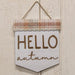 The Hello Autumn Plaid Sign is a decorative wall hanging in the shape of a wooden pennant. The sign reads "Hello Autumn" in brown lettering against a cream backdrop, and features a cozy brown and cream plaid border at the top. The top of the sign includes a jute rope to use for display on a wall or door to add a warm and simple autumnal touch to the home. Measures 9" high by 8" wide by .25" deep.