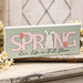 Live Life in Full Bloom Bunny Spring Box Sign is a wooden box sign with layered cutout design. The sign features a mint green and white patterned background with a pink cutout that reads "spring," with the letter "i" represented by the silhouette of a bunny. Glitter and flower accents adorn the sign and black text reads, "live life in full bloom." The sign is freestanding for stable display on a flat surface. Measures 4.5" high by 11.5" wide by 1.5" deep.