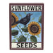 The Sunflower Seeds Box Sign is a wooden accent perfect for fall farmhouse decor. The sign is painted a rich mauve-taupe color with distressed edges for rustic flair. Printed design on the front of the sign is inspired by a seed packet, with a cream colored border and bold text reading “Sunflower Seeds.” The design depicts a black crow standing on a blooming sunflower plant against a blue sky background. An open back allows the sign to easily hang or stand freely. Measures 13.5” high by 9.5” wide by 2” deep.