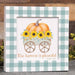 The Harvest Is Plentiful Sign is a decorative wooden box sign with a white and blue buffalo check border. The center of the sign has a white finish, reads "The harvest is plentiful"”Luke 10:2" in orange lettering, and displays a blue wagon holding a giant pumpkin and autumnal sunflowers. Display this sign hanging on a wall with a nail or place freestanding on a shelf or tabletop for a rustic and inspiring addition to the home during Fall. Measures 9" by 9" and 1.5" deep.