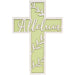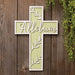Vined Alleluia Cross Sign is a wooden hanging decor piece made with inspirational spring style. The sign features the shape of a cross with layered mint green and cream wood design. An attached sawtooth hanger allows for easy display. The sign features vine accents and reads, "alleluia." Measures 15" high by 10" wide by .25" deep.