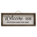 Welcome Framed Sign is a wooden sign with a dark stained frame, a white interior, and a jute hanger. Sign reads, "welcome-ish (depends who you are) in black text and it looks great on a covered door, porch, or in an entryway. Measures 6.5" high by 17.5" wide by 1" deep.