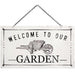 Welcome To Our Garden Metal Hanging Sign reads, "welcome to our garden" in black text over a white finish and it comes ready to hang by a black metal chain. Sign is distressed for an aged look and it is accented by a black border and a wheelbarrow graphic in the center. Measures 7.5" high by 13" wide.