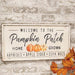 Welcome To The Pumpkin Patch Metal Sign is a metal sign with a heavily distressed white finish. Sign reads, "Welcome to the Pumpkin Patch - Home Grown - Hayrides - Apple Cider - Corn Maze " in black text and it features three watercolor-style pumpkin accents. It comes with two pre-installed sawtooth hangers for easy wall display and it measures 12.25" high by 24" wide by .75" deep.