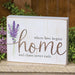 Where Love Begins Box Sign is a wooden box sign with white painted edges and a white shiplap background. The sign reads "Home" and "where love begins and chaos never ends" in black and taupe lettering and is decorated with a bundle of purple lavender flowers. The sign can be displayed freestanding or can be hung on a wall with a nail. Measures 6" high by 8" wide by 1.5" deep.
