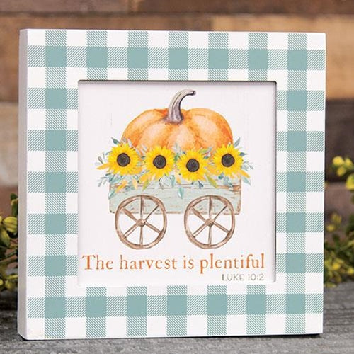 The Harvest Is Plentiful Sign is a decorative wooden box sign with a white and blue buffalo check border. The center of the sign has a white finish...