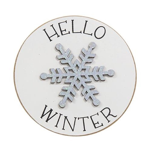 Hello Winter Snowflake Circle Easel Sign is a round sign with an easel stand for tabletop display. Block is made of wood and it features a white fi...