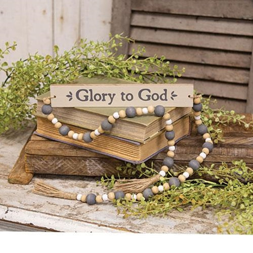 The Glory To God Garland Sign is a decorative tabletop piece featuring a rectangular wooden cutout, painted ivory and reading "Glory to God" in gr...