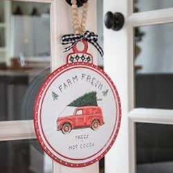 Farm Fresh Village Toys Metal Sign is a vintage-inspired, Christmas bauble sign that features a car hauling a Christmas tree and the phrase, "Farm ...