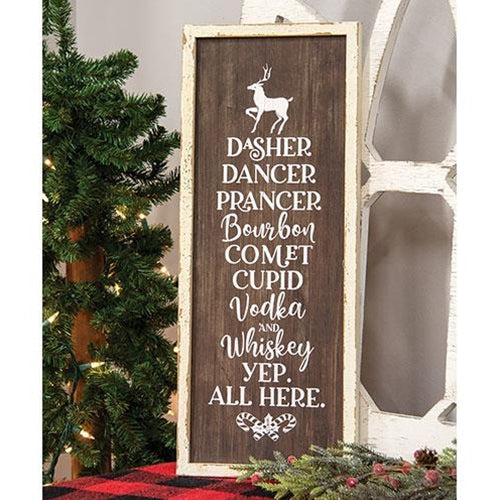 Dasher Dancer Prancer Bourbon Wood Sign is a festive holiday sign with a sense of humor. The wood sign lists, "Dasher, Dancer, Prancer, Bourbon, Co...