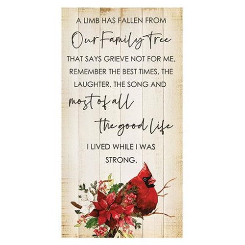 The A Limb Has Fallen Cardinal Sign is a decorative wooden sign with a distressed ivory shiplap background. The sign features black scripted letter...