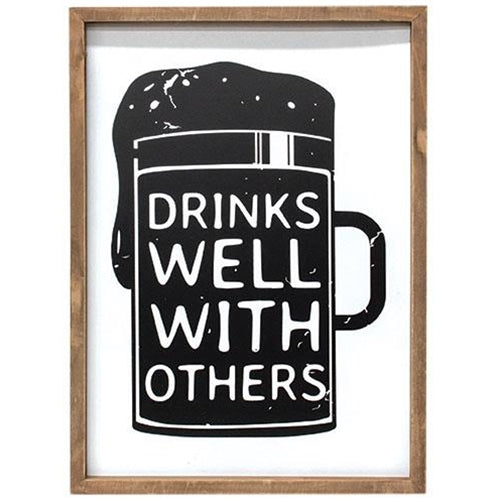 Drinks Well With Others Framed Sign is a wood framed sign that features an illustration of a foaming beer mug with the phrase, "Drinks Well With Ot...
