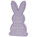 For Peeps Sake Chunky Bunny Sitters are decorative Easter accents made with playful pastel style. Crafted from wood in the shape of a marshmallow bunny, each sitter features a freestanding design for stable display on a flat surface. One is painted blue and features white text that reads “oh for peeps sake” in a mix of script and print. One is painted yellow and features black text that reads “happy Easter for my peeps,” and one is painted lavender and reads “the best Easter is one spent with your peeps.” Iridescent glitter accents the edge of each sitter. The blue sitter measures 6” high by 3.25” wide by .75” deep, the yellow sitter measures 6.5” high by 3.5” wide by .75” deep, and the lavender sitter measures 7” high by 4” wide by .75” deep.